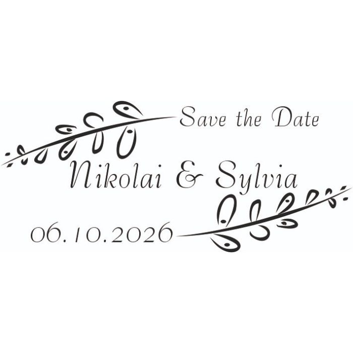 Der Motivstempel Hochzeit 39 hat eine Abdruckgröße von ca. 26 x 60 mm und ist als Holzstempel zu erhalten. Auf Wunsch senden wir euch auch einen Korrekturabzug zu.